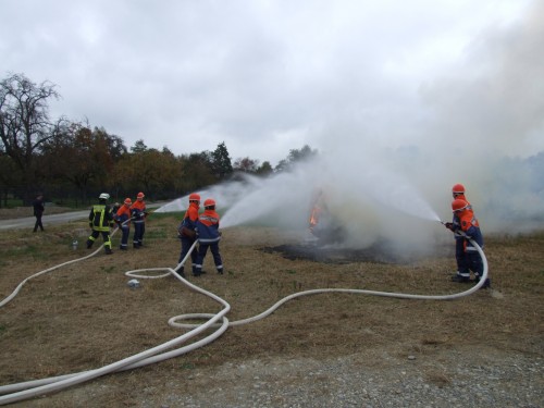 Konzentriert und rasch wurden von den Nachwuchskräften die Schläuche ausgerollt und gekuppelt und Ruck-Zuck wurde mit dem 1. Rohr die Brandbekämpfung aufgenommen. Nachdem auch das 2. und 3. Rohr im Einsatz waren, konnte das Feuer schnell gelöscht werden und der drohende Flächenbrand konnte verhindert werden.