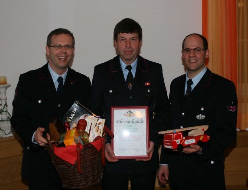 Als letzten Tagesordnungspunkt ist Willi Lorch, für 40 Jahre aktiven Dienst bei der Freiwilligen Feuerwehr geehrt worden. Ihm wurde die Ehrenurkunde der Abt. Beuren überreicht. Er wurde nicht nur für 40 Jahre Feuerwehrdienst geehrt, er führt auch seit dieser Zeit zuverlässig die Kasse der Abteilung Beuren.