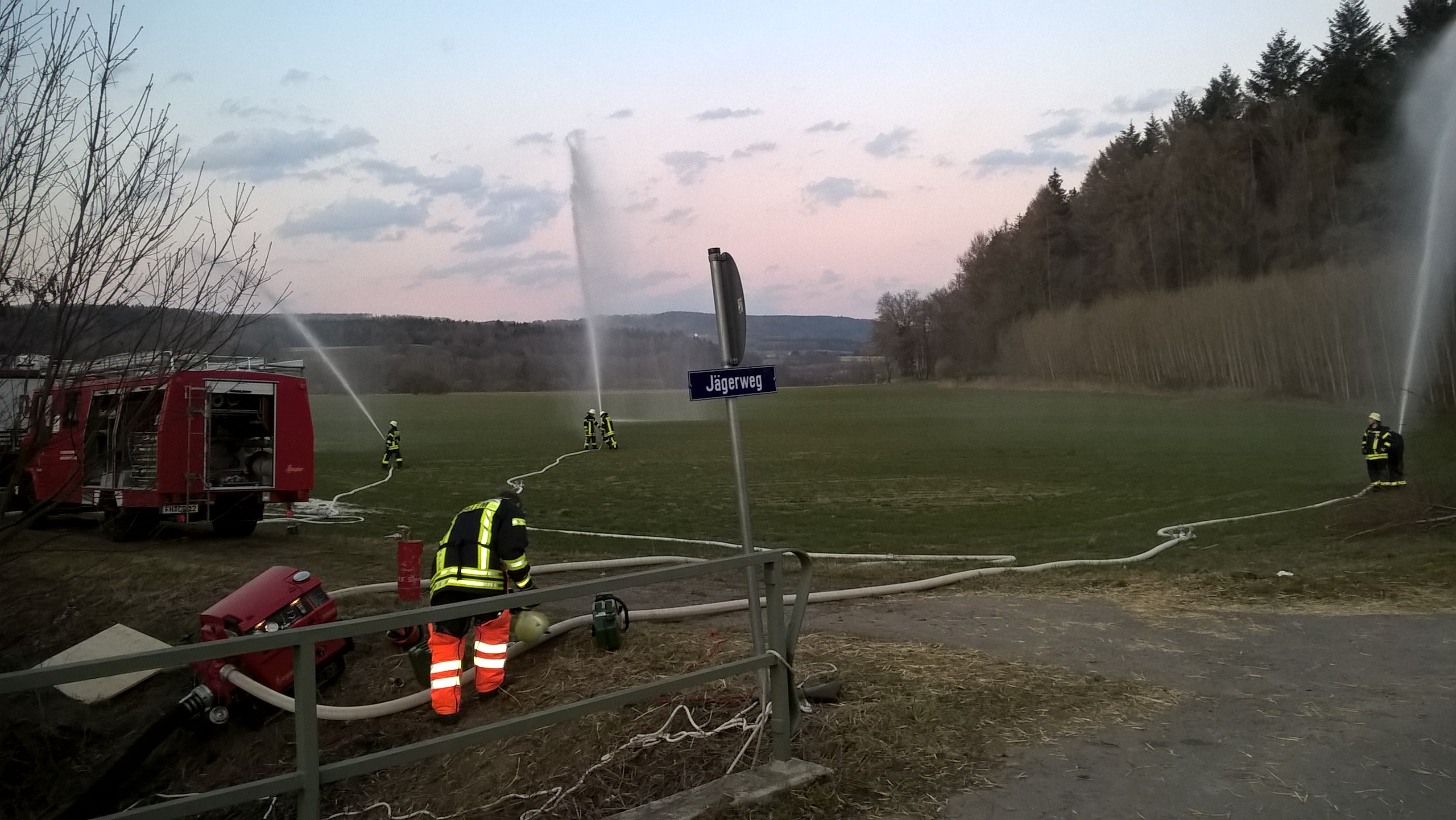 Deggenhausertal waren mehrere 1000 Liter Gülle in die Aach geflossen. Gegen 17:45 erreichte die Wasserverunreinigung die Brücke am Fischerhaus auf der Gemarkung Neufrach. Hier hatten die Einsatzkräfte bereits mehrere Pumpen in Stellung gebracht. Unterstützung kam vom THW Überlingen mit einer Großpumpe und einem Landwirt mit zwei Pumpfässern. Durch diese Maßnahmen wurden in der Minute 12.000 Liter Wasser/Güllegemisch aus der Deggenhauser Aach abgepumpt und auf umliegenden Felder ausgebracht. Gegen 21:00 Uhr konnte der Einsatzleiter feststellen, dass keine Gülle mehr im Bachwasser heranfloss, so dass die Pumparbeiten eingestellt werden konnten. Umfangreiche Aufräum- und Reinigungsarbeiten schlossen sich an. Unter Anderem kam ein Holztransportfahrzeug mit Kran zum Einsatz, um Heurundballen aus der Aach zu bergen, welche zuvor zum Aufstauen des Bachs von den Einsatzkräften eingebracht wurden. Gegen 23:30 Uhr war die Feuerwehr Salem wieder einsatzbereit. | ||
