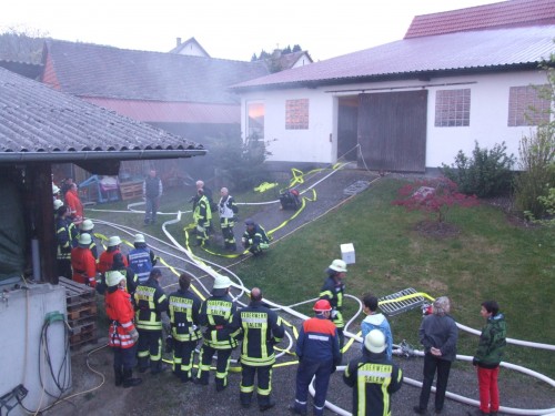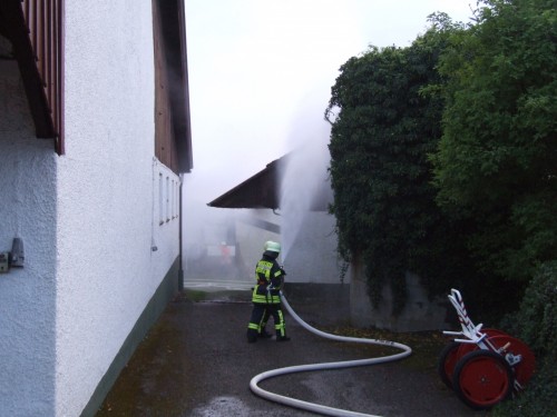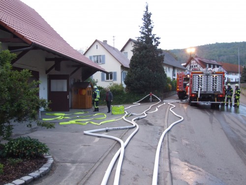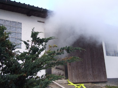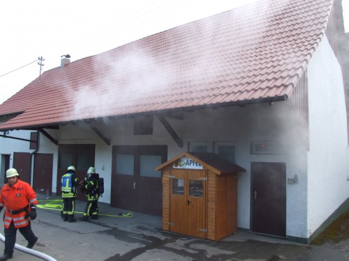 Nach der Alarmierung traf als erstes Fahrzeug das Tragkraftspritzenfahrzeug der Abteilung Beuren verstärkt mit Kameraden der Abteilung Weildorf am Einsatzort ein. Abteilungskommandant Martin Weißhaupt erkannte sofort, dass hier Eile geboten war und ließ somit unmittelbar den 2. Löschzug der Gesamtfeuerwehr Salem anfahren. Während Weißhaupt sofort mit der Erkundung begann, bauten die weiteren Kameraden die Wasserversorgung von einem nahen Hydranten auf und ein Trupp rüstete sich mit Atemschutzgeräten aus um zur Personenrettung in die Garage vor zu gehen. Nachdem der Einsatzleitwagen der FW Salem eingetroffen war übernahm Martin Weißhaupt die Gesamteinsatzleitung und übergab seine bisherige Funktion des Fahrzeugführers an einen weiteren Kameraden der Abtlg. Beuren. Dadurch, dass sich der Einsatz noch in der frühen Entwicklungsphase befand, klappte dieser Wechsel reibungslos und so konnte sich der Einsatzleiter schnell auf die weitere Organisation des Einsatzes konzentrieren.