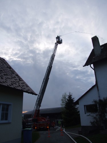 Nach dem der Löschzug komplett eingetroffen war, unterstützen die Kameraden des LF16 bei der Personensuche innerhalb des Gebäudes. Die Drehleiter wurde in Stellung gebracht und baute eine Riegelstellung zu den nebenstehenden Gebäuden auf. Auf der Vorderseite des Anwesens wurde ein 2ter Einsatzabschnitt eingerichtet, wo das Tanklöschfahrzeug und der Schlauchwagen eingesetzt wurden. Hier ging ebenfalls ein Trupp unter Atemschutz ins Gebäude vor, während der Schlauchwagen von der Sparkassenfiliale her eine Wasserversorgung zur Einsatzstelle aufbaute. Während die Suche und Rettung nach den vermissten Personen im Inneren der Garage am Laufen war, wurde im Außenbereich eine umfassende Riegelstellung zu allen Seiten hin aufgebaut. Durch diesen massiven Einsatz konnte der angenommene Brand letztlich auf den betroffenen Bereich begrenzt werden. Nachdem nach ca. 30 Minuten alle vermissten Personen gerettet waren, gab Einsatzleiter Martin Weißhaupt den Befehl „Wasser Halt“.