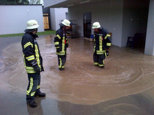 Als die Kräfte der Feuerwehr Salem vor Ort eintrafen, lief ein Bach aus Wasser und Schlamm am hinteren Teil des Geländes den Hang hinunter und hatte schon die Bodeneinläufe verstopft, was eine Überschwemmung der Küche zur Folge hatte. Ebenfalls betroffen war das Haus 2, an dessen Stirnseite sich ebenfalls große Massen an Wasser und Schlamm ergossen hatten, die die dortigen Lichtschächte und die Terrasse überfluteten. Die Einsatzkräfte der Feuerwehr sicherten daraufhin mit Sandsäcken die Lichtschächte und pumpten das aufgestaute Wasser ab. Anschließend säuberten Sie die Bodeneinläufe von Schlamm, so dass das Wasser wieder ungehindert abfließen konnte. Ebenfalls vor Ort waren 2 Kollegen des Bauhof Salem, die die Zufahrtsstraße von Schlamm und Schmutz befreiten. Nach gut 2 Stunden konnten die eingesetzten Kräfte die Einsatzstelle verlassen und ins Gerätehaus zurück kehren. | ||