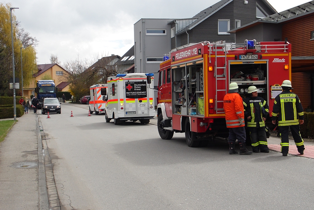 Zu einem Wohnungsbrand in der Bahnhofstraße wurde die Feuerwehr Salem am Freitagmorgen um 11:05 alarmiert. Der Anrufer meldete bei der Leitstelle Bodensee-Oberschwaben ein brennendes Fernsehgerät. Beim Eintreffen der ersten Kräfte hatte sich der Brand auf das gesamte Zimmer ausgebreitet. Mit 2-C Rohren und 3 Atemschutztrupps konnte die Feuerwehr bereits 10 Minuten nach dem Eintreffen "Feuer aus" melden. Die Nachlöscharbeiten und Lüftungsmaßnahmen zogen sich allerdings noch einige Zeit hin. Drei Bewohner konnten sich noch vor dem Eintreffen der Feuerwehr in Sicherheit bringen. Sie wurden vom DRK betreut und mit Verdacht auf Rauchvergiftung ins Krankenhaus gebracht. Neben dem Regelrettungsdienst war auch die SEG Salemertal vor Ort im Einsatz. Beamte der Landespolizei nahmen weitere Ermittlungen auf. Während des Löscharbeiten musste die Bahnhofstraße für den Verkehr komplett gesperrt werden. | ||