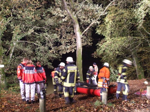 Beim Eintreffen der ersten Kräfte wurde in der Mitte des Weihers ein Ruderboot gesichtet. Nachdem die Besatzung des RW`s mit Hilfe des Schlauchbootes das Ruderboot erreichte, wurde festgestellt, dass es sich um eine aufblasbare Puppe handelte, die eingesetzt wurde, um die Fischreiher von dem Weiher fernzuhalten. Das Ruderboot mit der Puppe wurde an Land gezogen und gesichert | ||