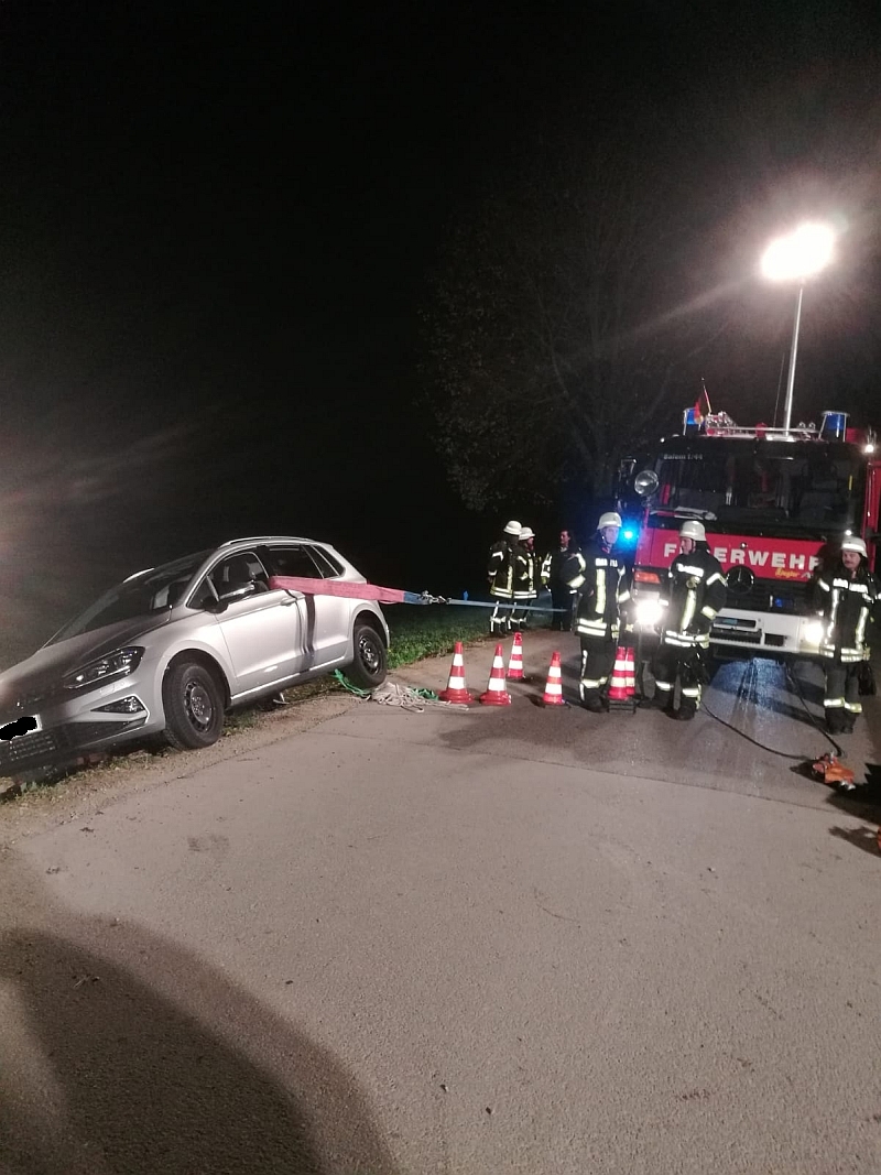 Der dritte Einsatz am 08.11.2018 führte die Feuerwehr Salem auf den Verbindungsweg zwischen Wehheim und Mittelstenweiler. Der Verbindungsweg ist aktuell ein stark befahrener Schleichweg, da die Ortsdurchfahrt Neufrach immer noch saniert wird. Beim Eintreffen der ersten Kräfte stellten diese fest, dass ein Fahrzeug von der Fahrbahn abgekommen und schräg auf dem unbefestigten Bankett stand. Der Fahrer befand sich immer noch im Fahrzeug, da die Gefahr bestand, dass das Fahrzeug weiter Abrutscht. Der eCall des relativ neuen Fahrzeugs hatte ausgelöst. Nach der Stabilisierung des PKW konnte der Fahrer unverletzt befreit werden. Um das Gefährt zu bergen, wurde ein Abschleppfahrzeug mit Kran angefordert. Bevor das Abschleppunternehmen jedoch den Havaristen an den Kranhaken nehmen konnte, musste ein weiteres Fahrzeug geborgen werden, welches nach einem Wendeversuch auf der engen Straße sich festgefahren hatte.