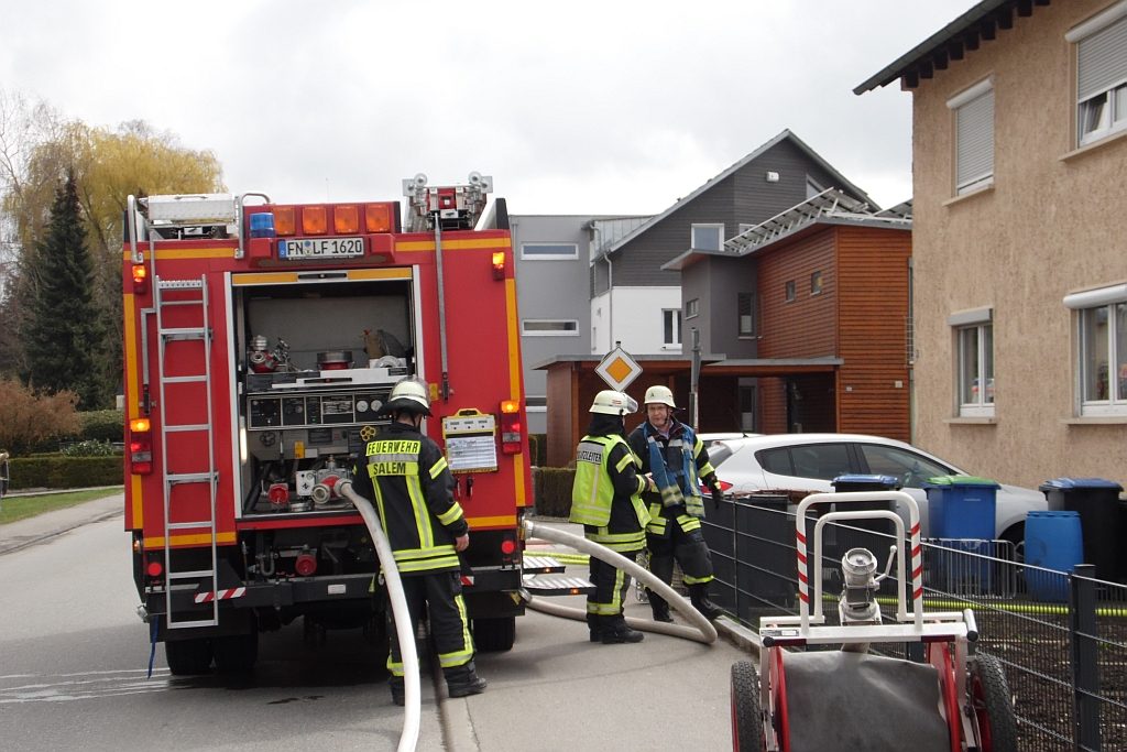Zu einem Wohnungsbrand in der Bahnhofstraße wurde die Feuerwehr Salem am Freitagmorgen um 11:05 alarmiert. Der Anrufer meldete bei der Leitstelle Bodensee-Oberschwaben ein brennendes Fernsehgerät. Beim Eintreffen der ersten Kräfte hatte sich der Brand auf das gesamte Zimmer ausgebreitet. Mit 2-C Rohren und 3 Atemschutztrupps konnte die Feuerwehr bereits 10 Minuten nach dem Eintreffen "Feuer aus" melden. Die Nachlöscharbeiten und Lüftungsmaßnahmen zogen sich allerdings noch einige Zeit hin. Drei Bewohner konnten sich noch vor dem Eintreffen der Feuerwehr in Sicherheit bringen. Sie wurden vom DRK betreut und mit Verdacht auf Rauchvergiftung ins Krankenhaus gebracht. Neben dem Regelrettungsdienst war auch die SEG Salemertal vor Ort im Einsatz. Beamte der Landespolizei nahmen weitere Ermittlungen auf. Während des Löscharbeiten musste die Bahnhofstraße für den Verkehr komplett gesperrt werden. | ||